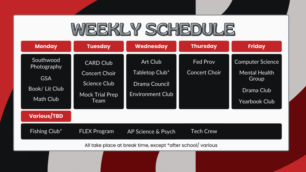 Southwood prides itself on being an involved community and makes sure that a wide variety of opportunities are available for students. Check out the clubs offered at Southwood and get involved in the options that are a right fit for you!