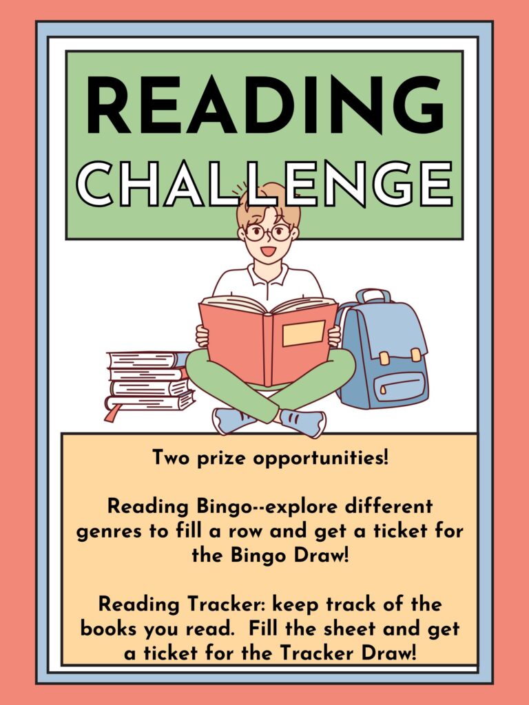 Check out our current reading challenges. You can pick up tracking forms in the library, or print them off, and trade completed forms for prize ballots.